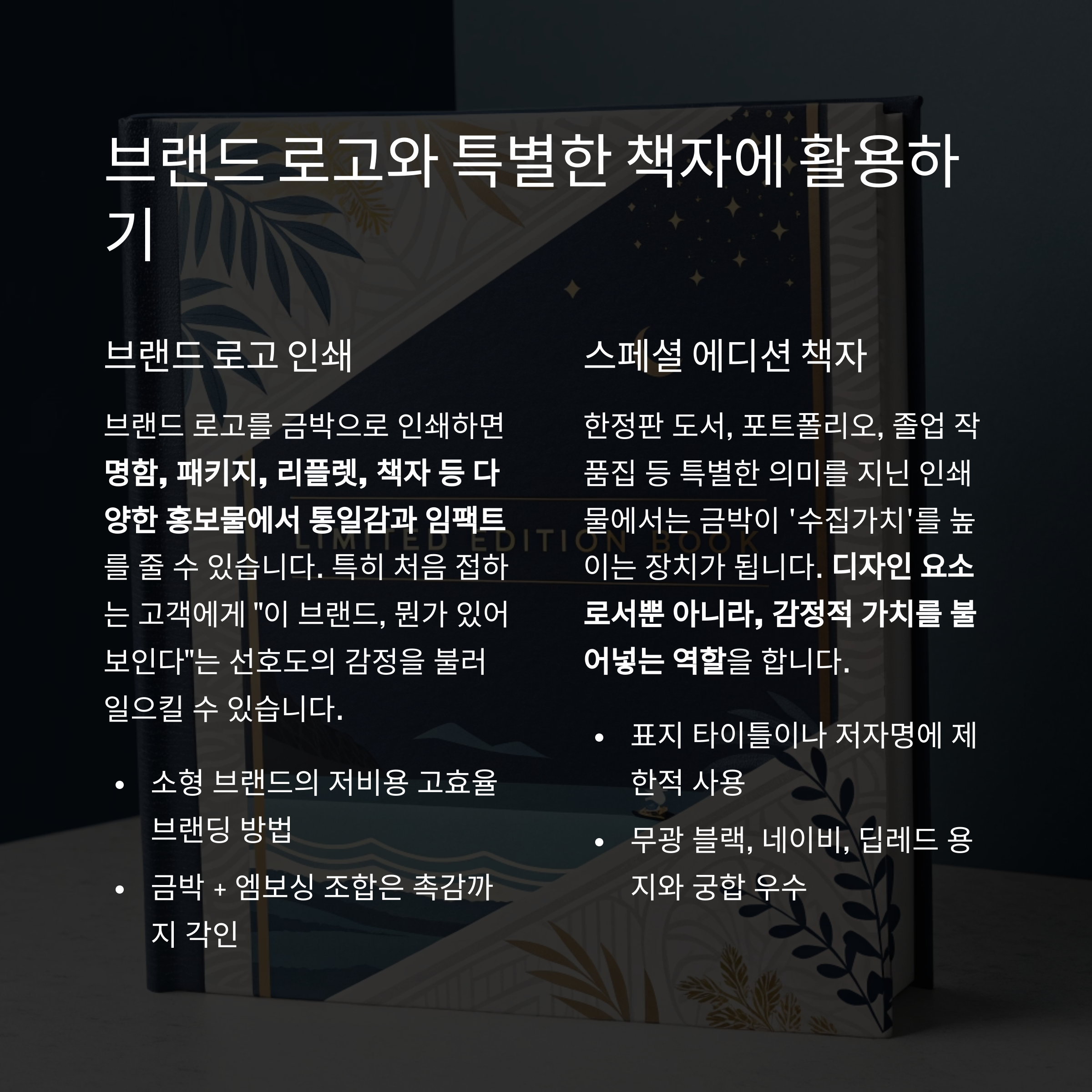 금박 포인트 하나로 전문성과 세련미를 동시에 전달할 수 있습니다.
