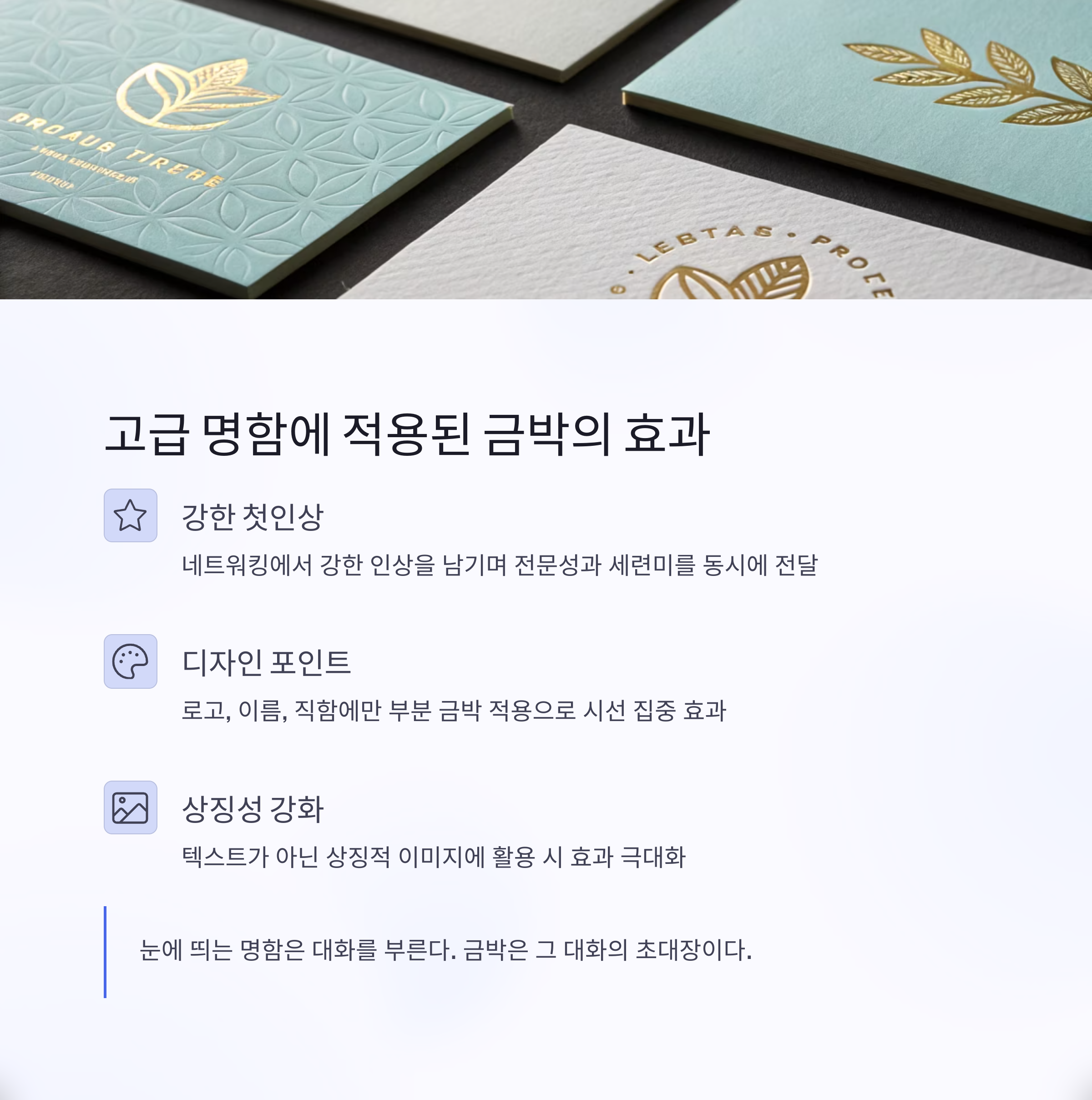 “눈에 띄는 명함은 대화를 부른다. 금박은 그 대화의 초대장이다.”