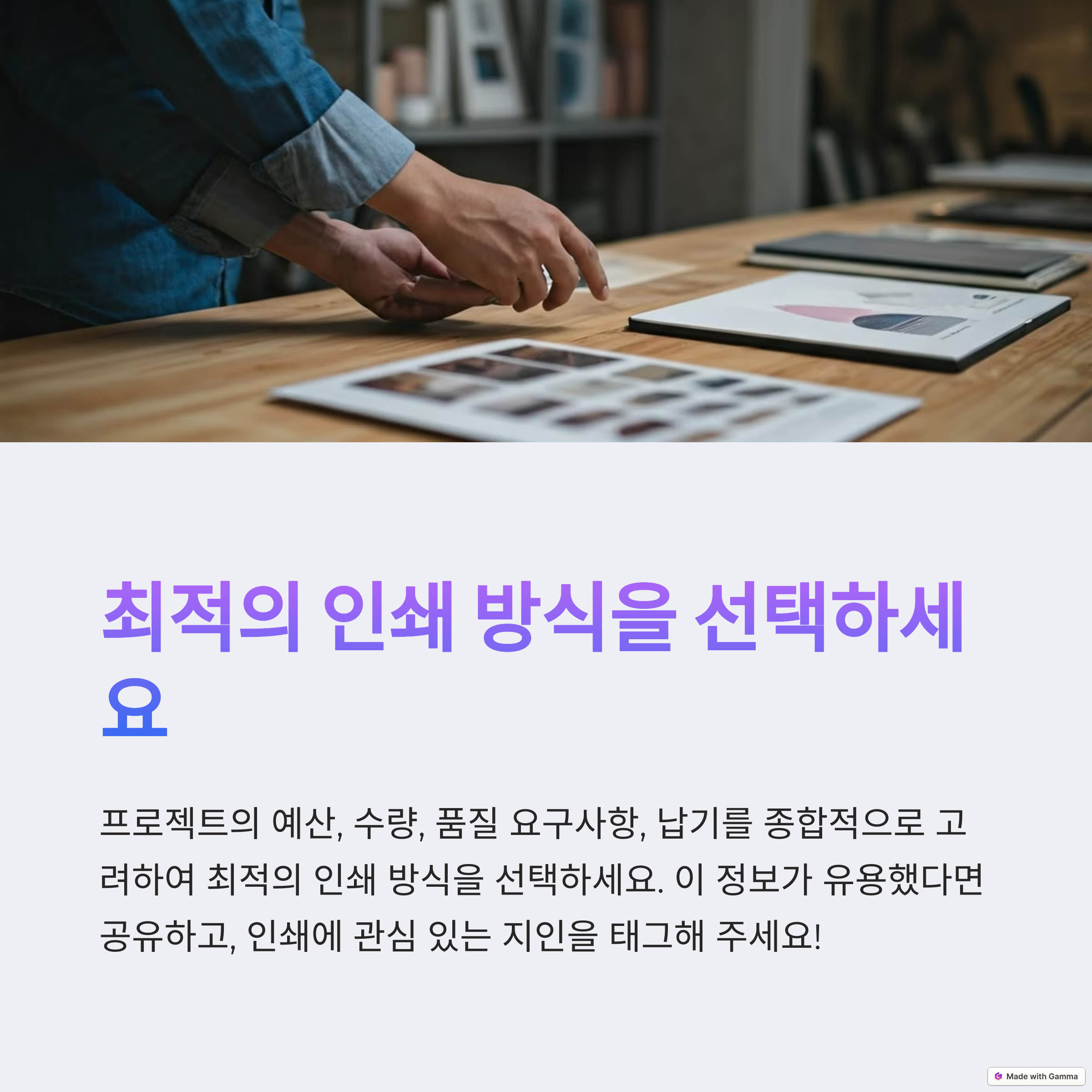| 맞춤형, 데이터 기반 출력 가능 | 인쇄판 제작 필요, 초기 비용 존재 | 시안, 소량은 디지털 / 대량은 옵셋 |