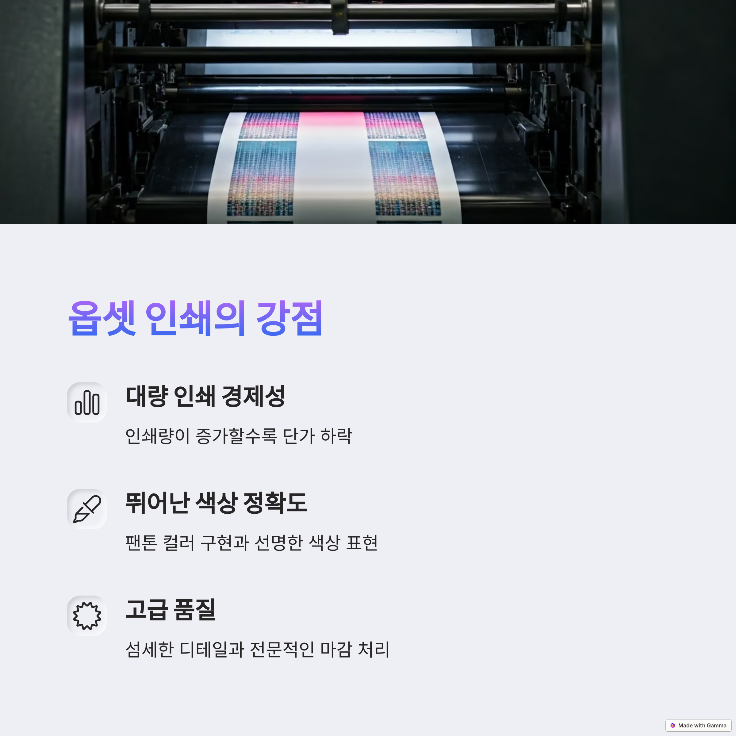 | 옵셋 인쇄 | 대량 인쇄에 유리한 고품질 전통 인쇄 방식 |