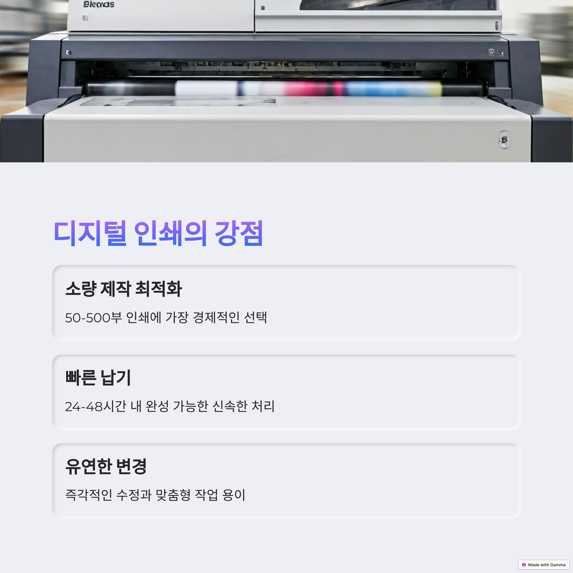 | 디지털 인쇄 장점 | 옵셋 인쇄 특징 | 선택 기준 |