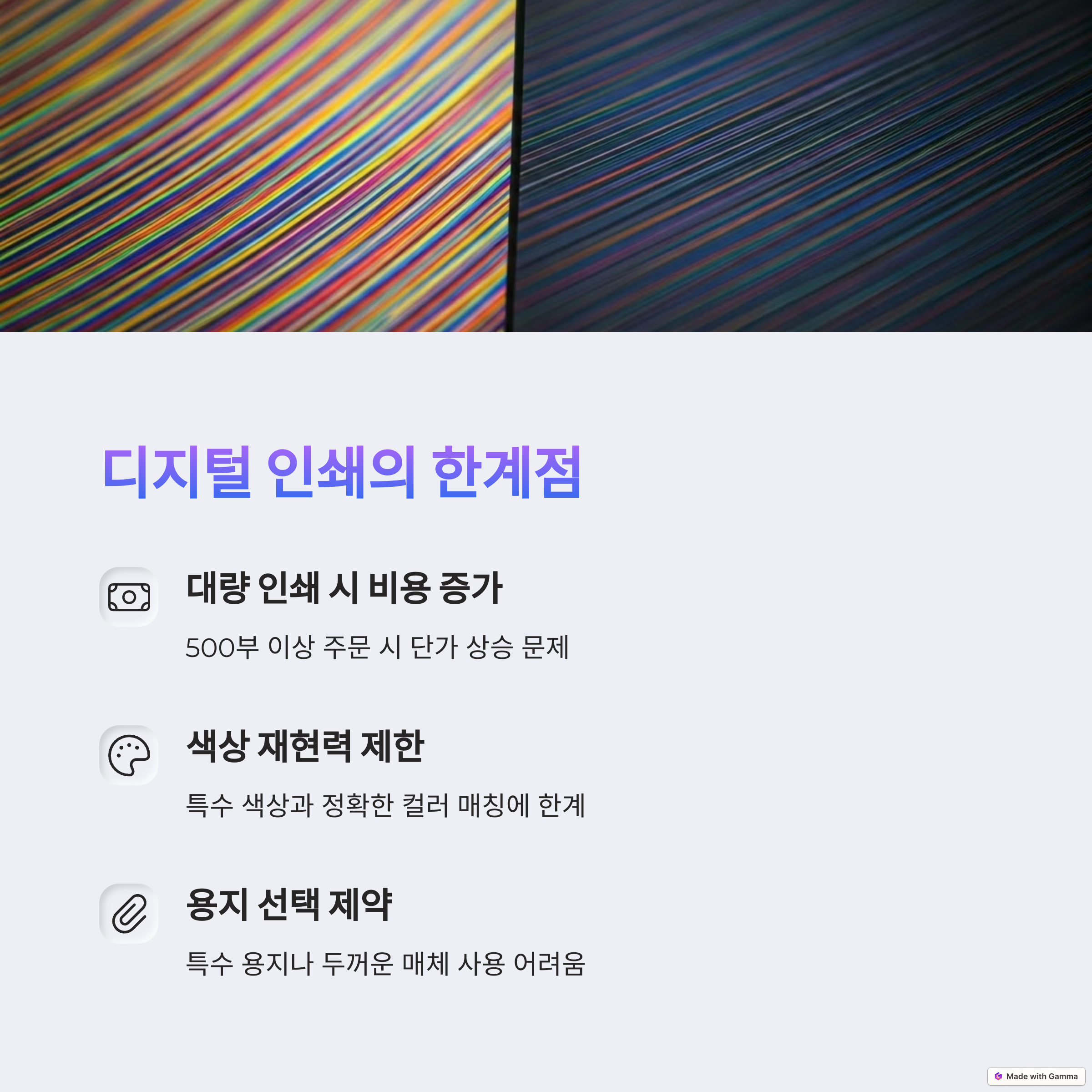 | 디지털 인쇄 | 빠르고 유연한 출력, 소량에 적합한 인쇄 방식 |