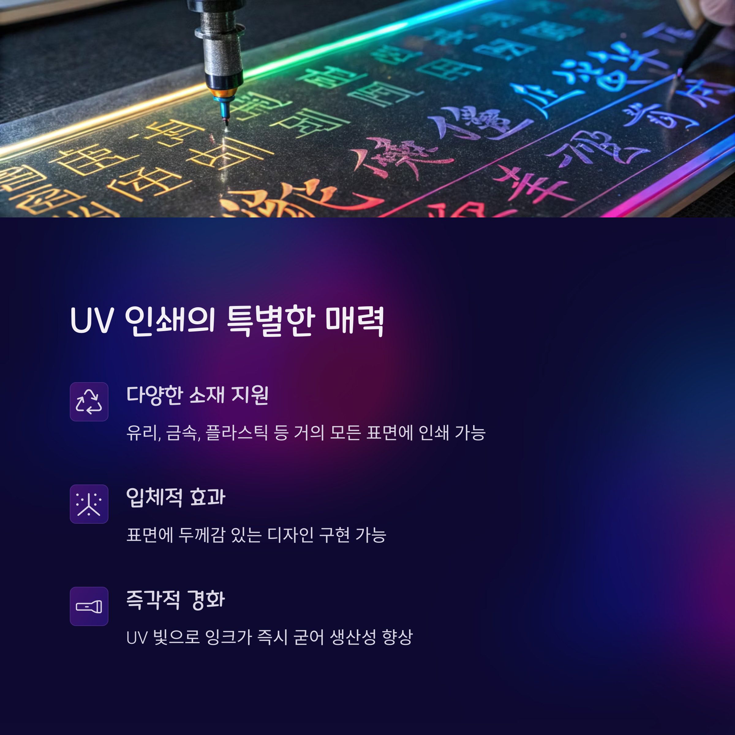 | UV 인쇄 | 자외선을 이용한 즉시 건조 방식으로 입체감 표현 가능 |