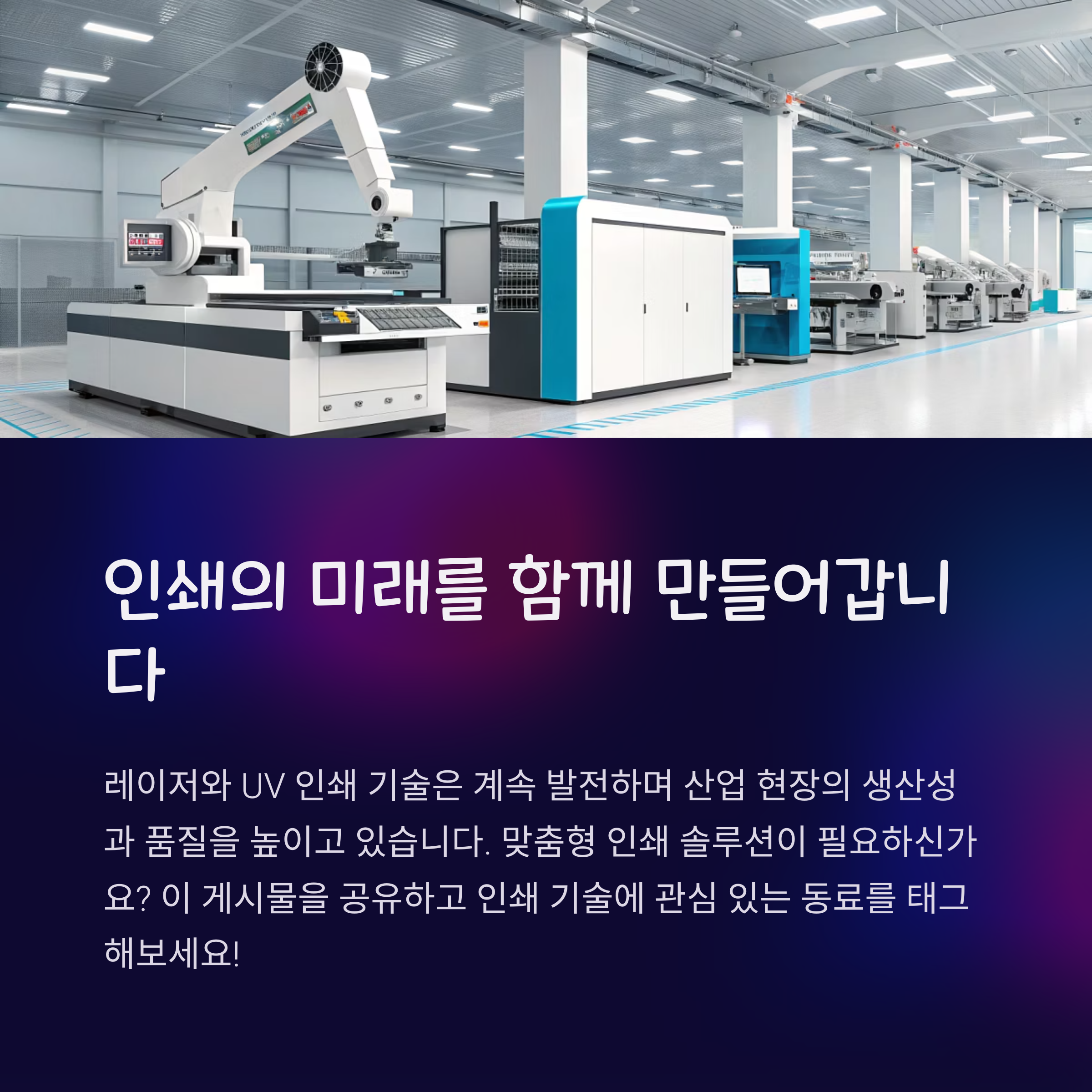 레이저 인쇄와 UV 인쇄는 각각의 특성과 장점을 갖고 있는 고유한 인쇄 방식입니다. 두 방식의 병행은 기술적으로 가능하지만, 인쇄물의 목적, 사용 용도, 재질, 디자인 방향에 따라 병행 여부를 신중히 판단해야 합니다. 정밀한 샘플링과 테스트를 통해 기대한 품질을 확보할 수 있다면, 병행 인쇄는 높은 시각적 효과와 브랜드 가치 상승이라는 이점을 제공할 수 있습니다. 결국 핵심은, 기술을 얼마나 이해하고 응용할 수 있는가에 달려 있습니다. 여러분의 프로젝트에 최적의 결과가 있기를 바랍니다.