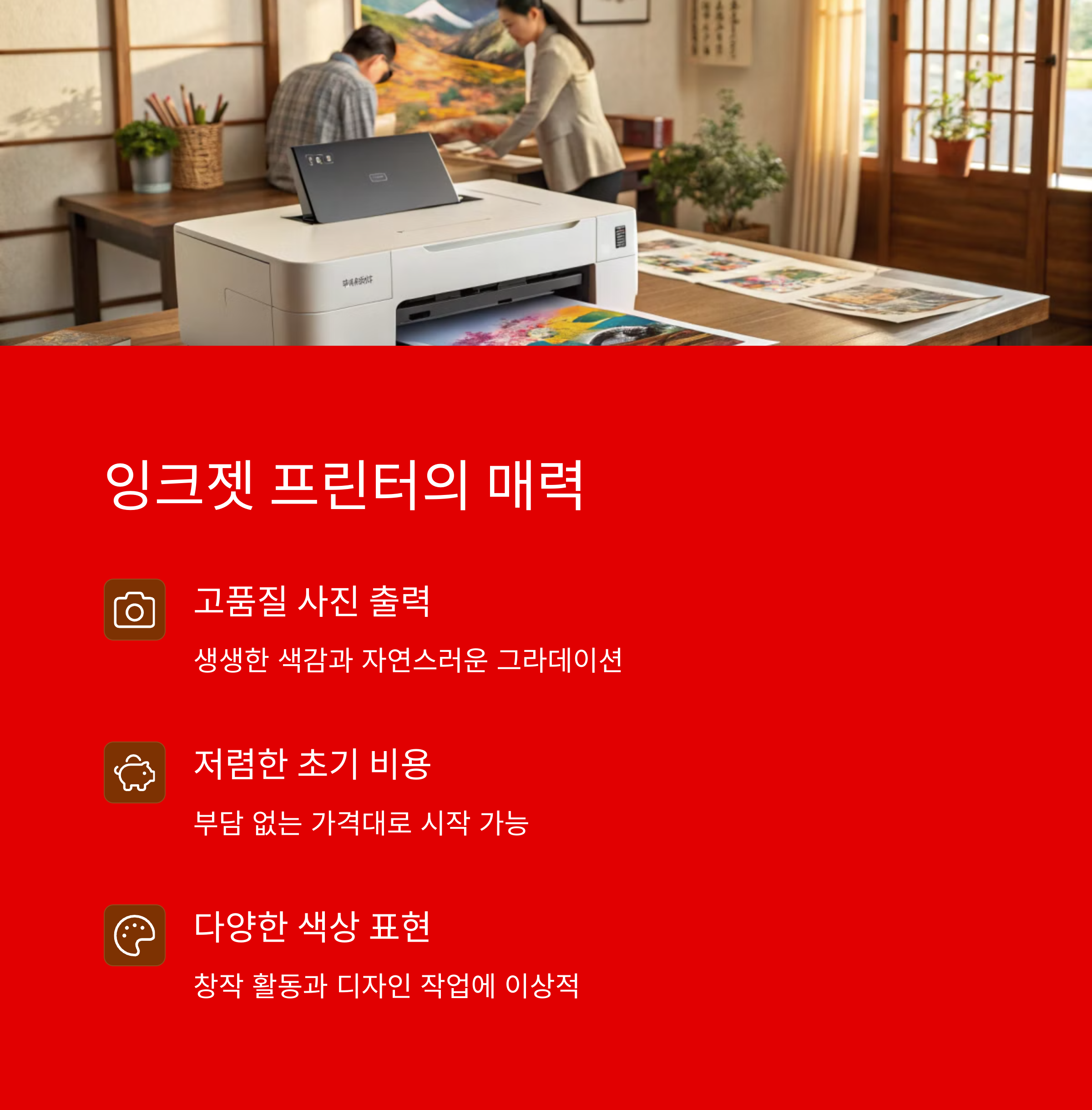 | 잉크젯 프린터 장점 | 사진 품질 뛰어나고 초기 구매 비용 저렴 |