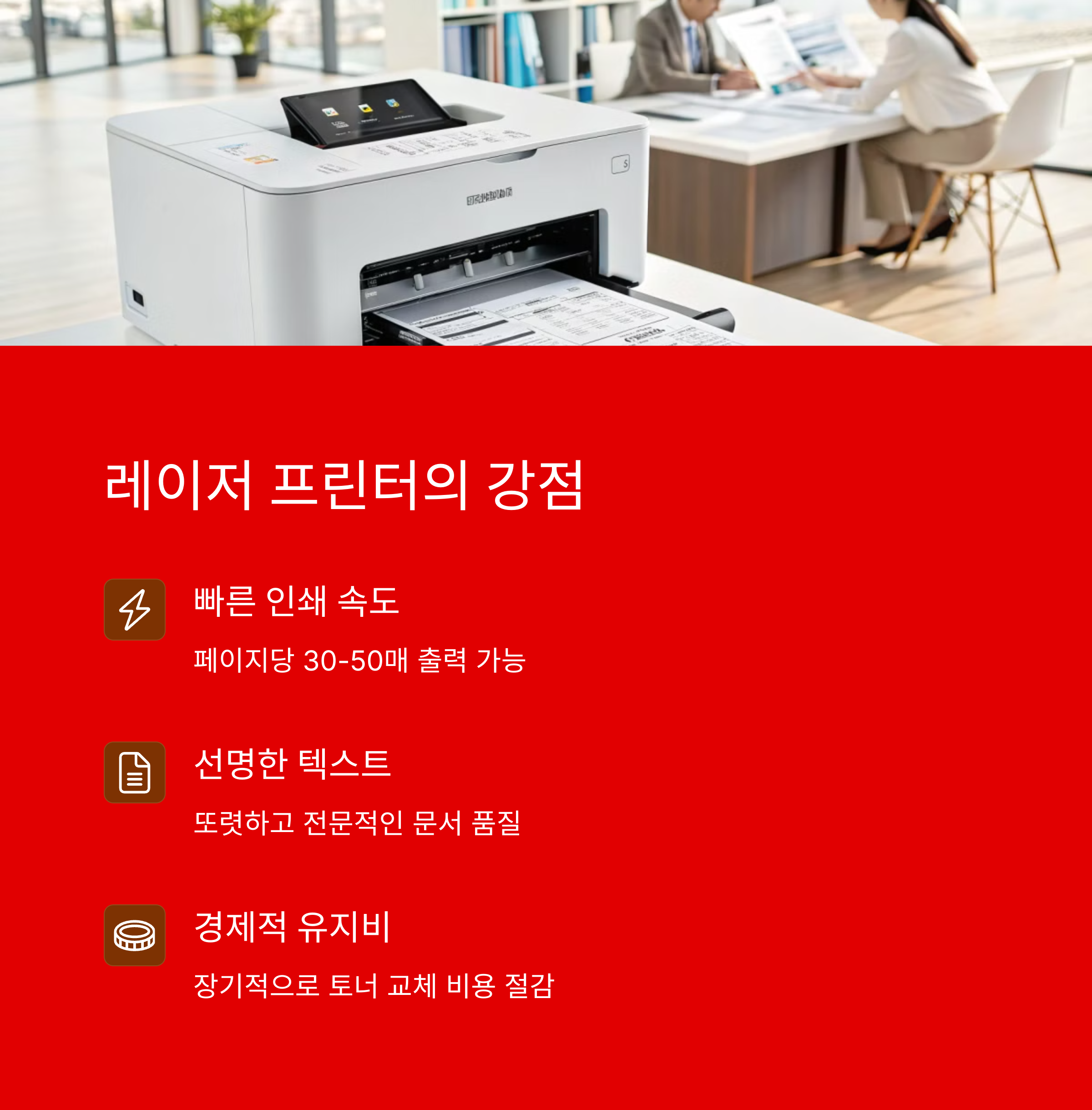 | 레이저 프린터 장점 | 인쇄 속도 빠르고 텍스트 품질이 선명함 |