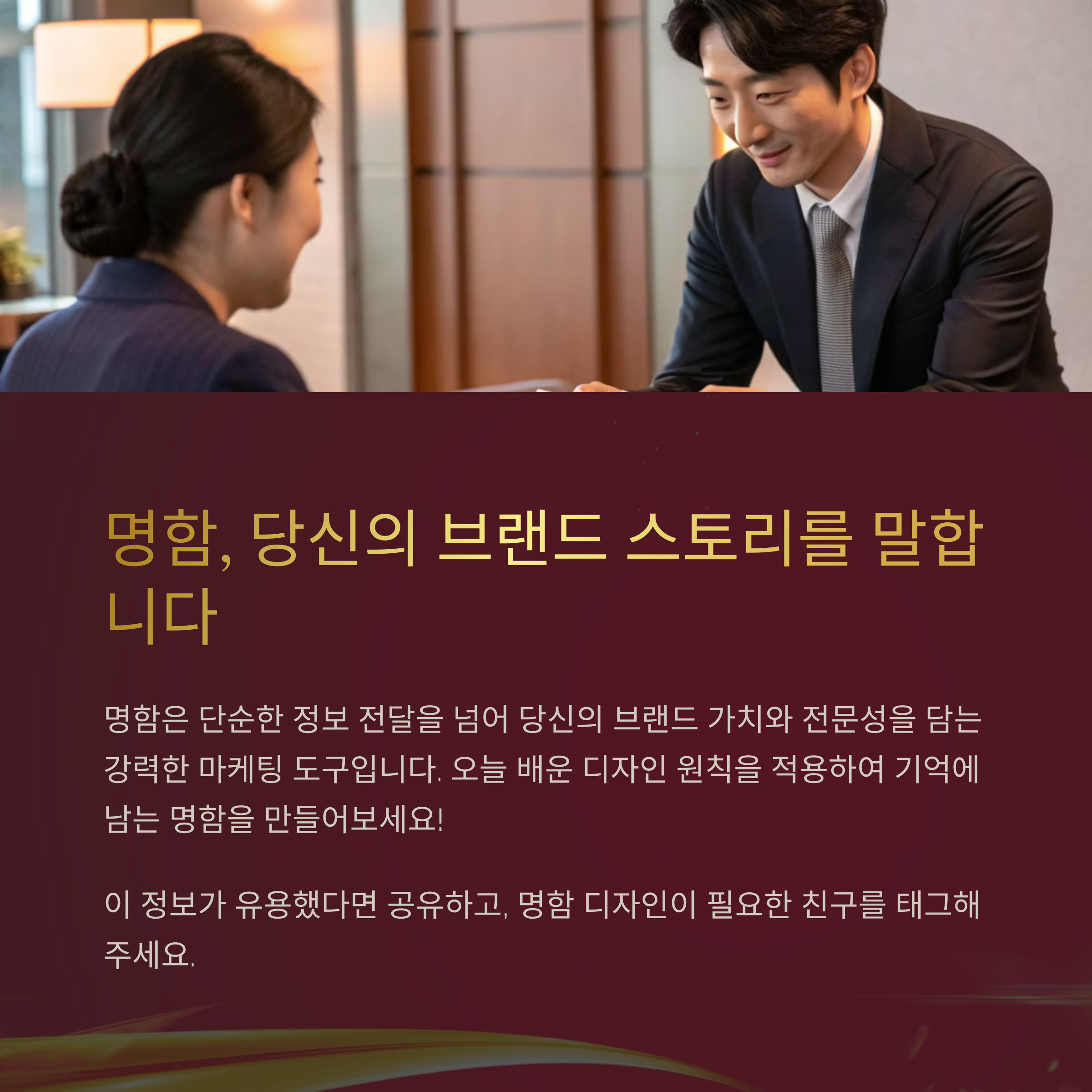 명함은 단순한 명찰이 아니라, 브랜드 커뮤니케이션의 시작입니다. 한눈에 들어오는 정보 배치, 깔끔한 디자인, 고품질 인쇄까지 모든 것이 조화를 이뤄야 강한 인상을 남길 수 있습니다. 디지털 시대에도 여전히 종이 명함은 유효합니다. 오히려 오프라인에서 주는 감성이 디지털보다 깊은 신뢰를 주기도 하죠. 지금 이 글을 읽고 계신다면, 여러분의 명함은 기억에 남는 무기로 바뀔 준비가 되셨다는 의미일 겁니다. 이제는 아무거나 뽑지 마세요. 전략적으로 디자인하고, 정성 들여 제작해 보세요. 그 명함 한 장이 기회를 만듭니다.
