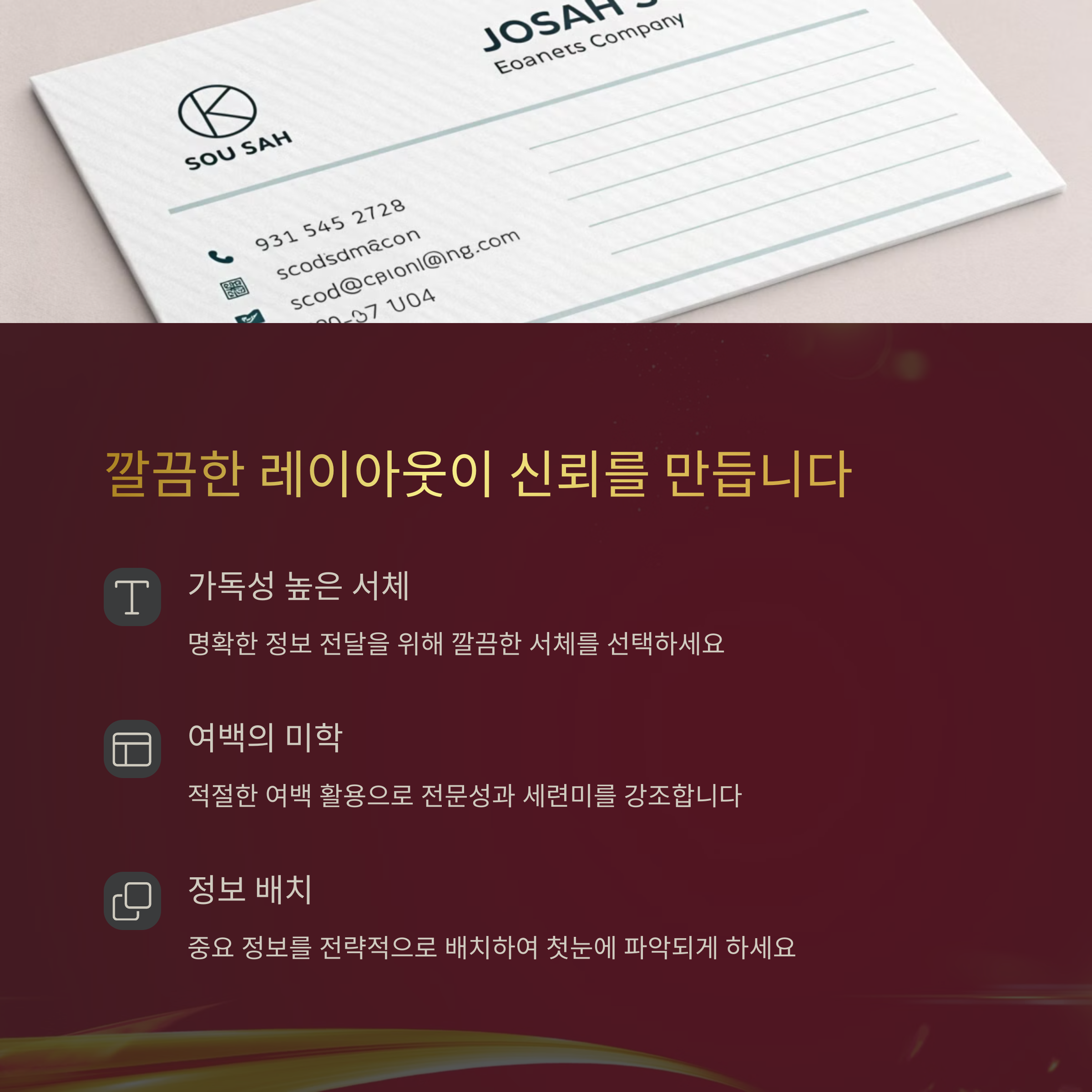| 명함 디자인 핵심 | 브랜드 이미지와 일관성 유지가 핵심입니다. |