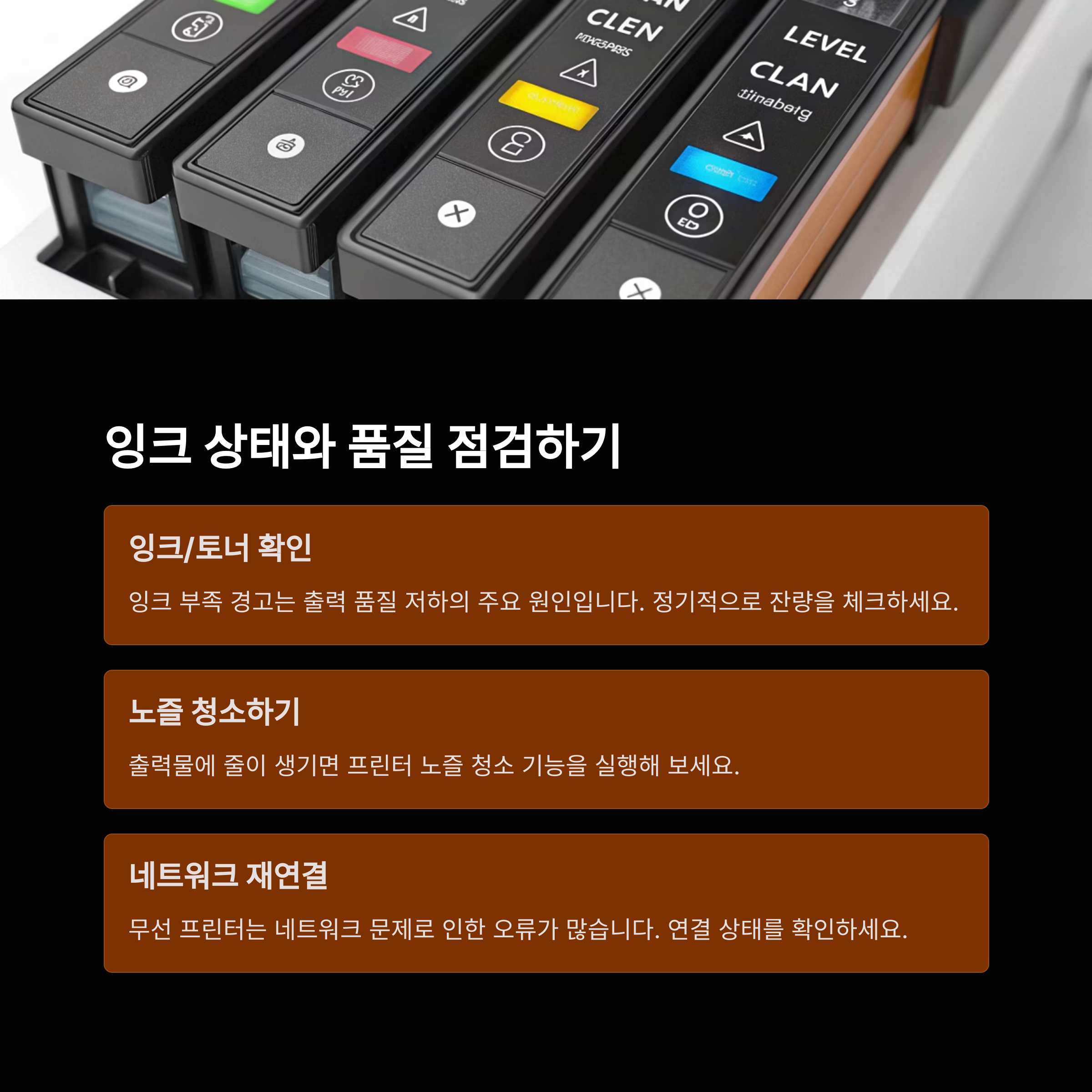 인쇄가 흐릿하거나 한쪽만 나오고 있다면 대부분 잉크 문제예요. 그런데 단순히 잉크 부족이 아니라 노즐 막힘이나 잉크 유통기한 문제일 수도 있다는 거, 알고 계셨나요?