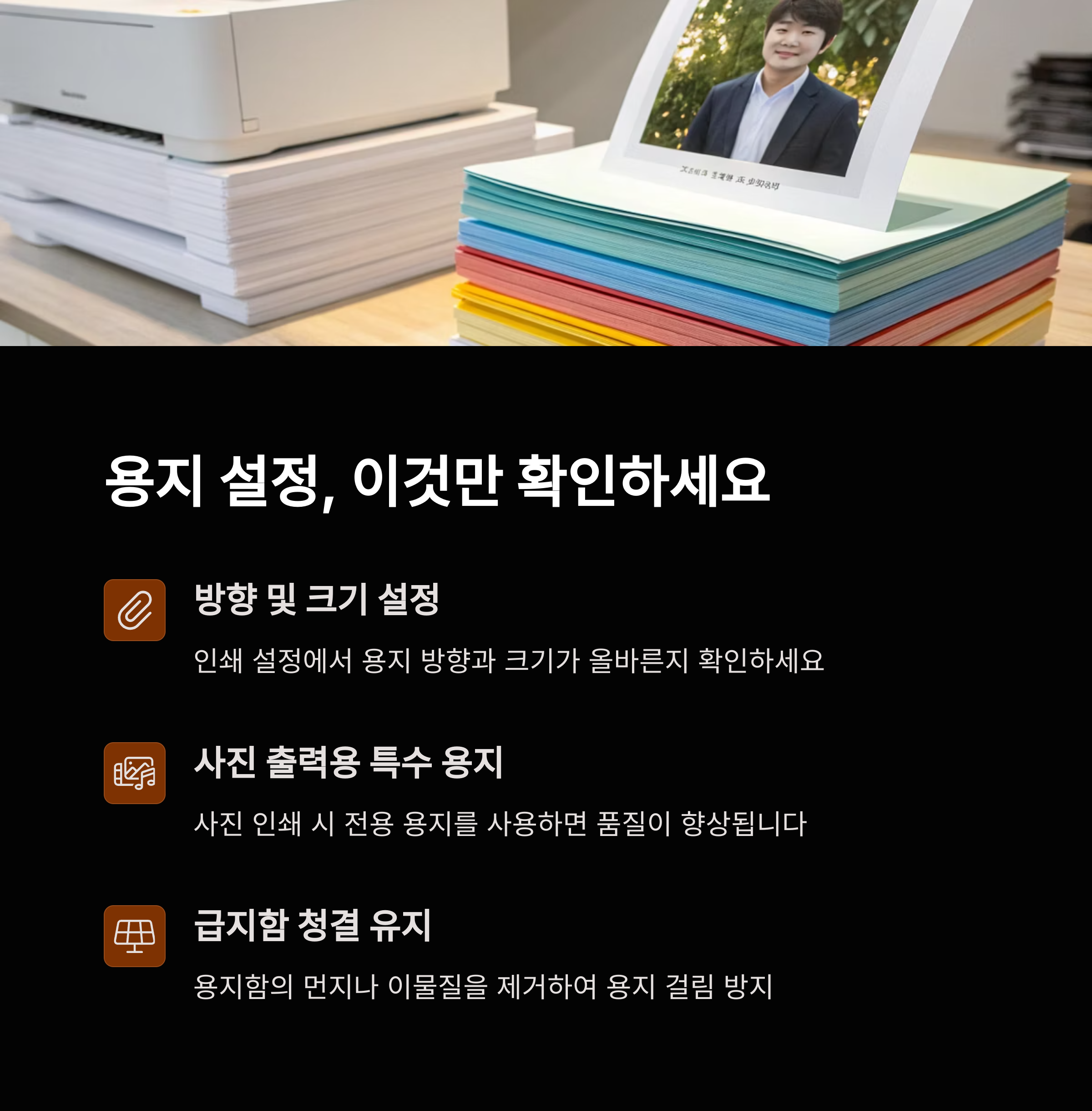 의외로 많은 분들이 놓치는 게 이 ‘용지 설정’이에요. 특히 양면 인쇄하거나 사진 같은 걸 출력할 때, 설정 하나로 결과물이 완전히 달라지거든요. 기본 A4 설정이라도 ‘평범한 용지’인지 ‘고급 용지’인지에 따라 잉크 분사량이 달라지기 때문에 꼭 체크해 주세요.