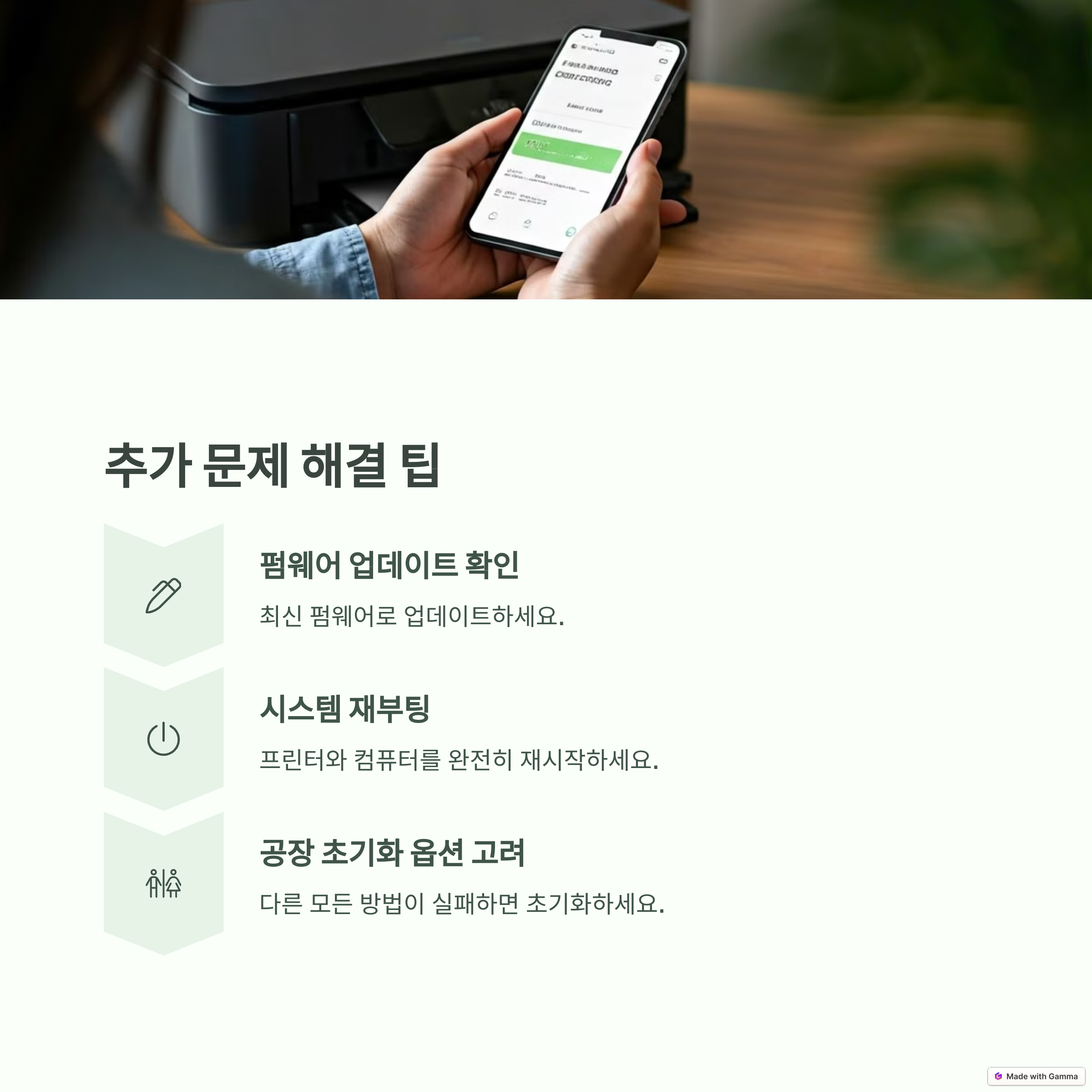 | 자체 기능으로 노즐 막힘 해소 | 최신 버전 다운로드 필요 | 잔량 부족 및 비정품 여부 점검 |