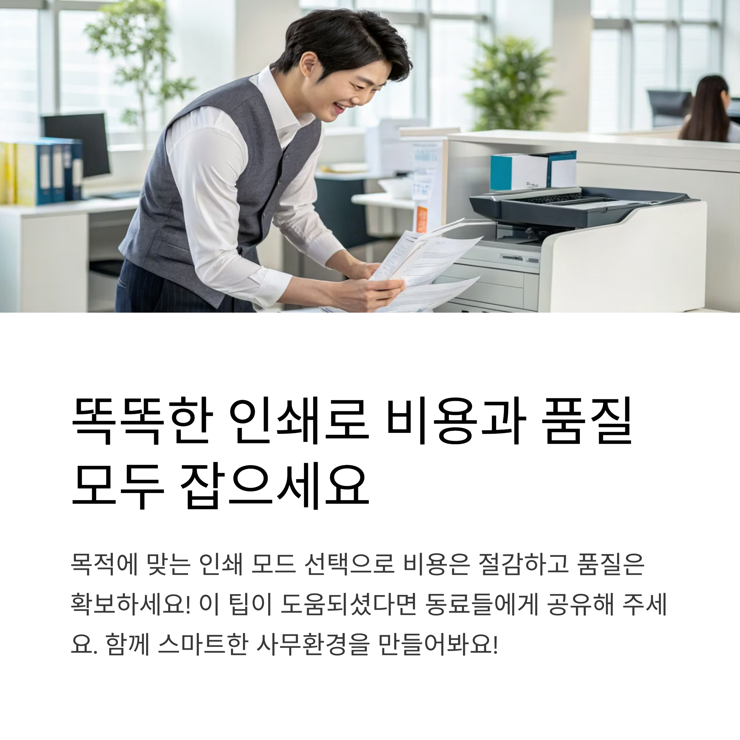 오늘은 '잉크 절약 모드 vs 일반 인쇄 모드'에 대해 깊이 있게 알아봤어요. 프린터를 조금 더 효율적으로 쓰고 싶을 때, 상황에 따라 인쇄 모드를 똑똑하게 선택하는 것만으로도 비용을 꽤 줄일 수 있다는 사실, 진짜 놀랍지 않나요? 우리 일상 속 작은 습관이 모여 큰 차이를 만든다는 거, 이번 기회에 꼭 실천해봐요! 궁금한 점이 있으면 언제든 댓글로 소통해요. 여러분의 소중한 경험담도 기다릴게요. 😊