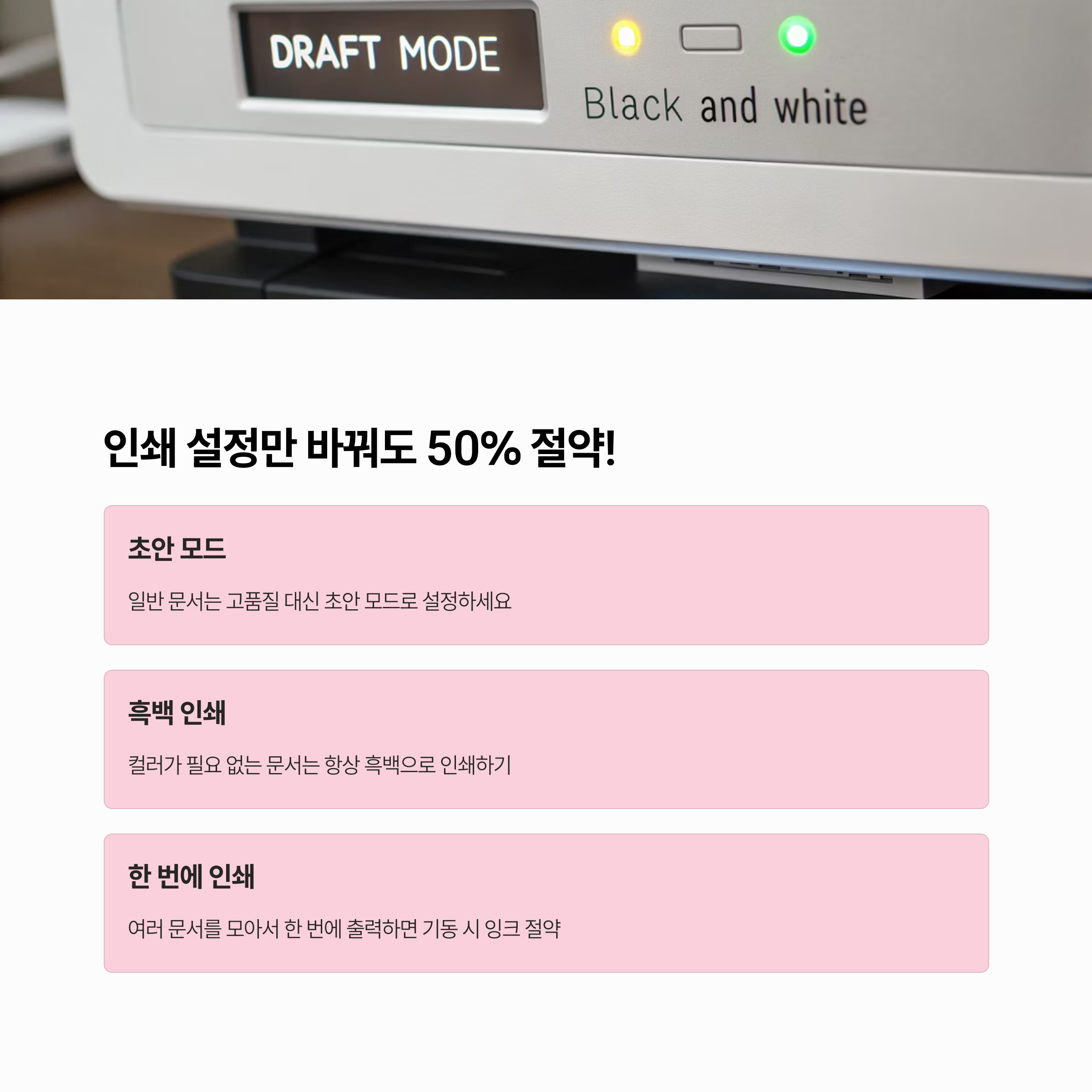 모든 문서를 완벽 품질로 인쇄할 필요는 없어요. 내부 검토용, 초안 문서는 'Draft Mode(초안 모드)'로 설정하면 잉크를 덜 사용해서 더 빠르게 출력도 가능하답니다. 아래 리스트처럼 간단하게 적용할 수 있어요.