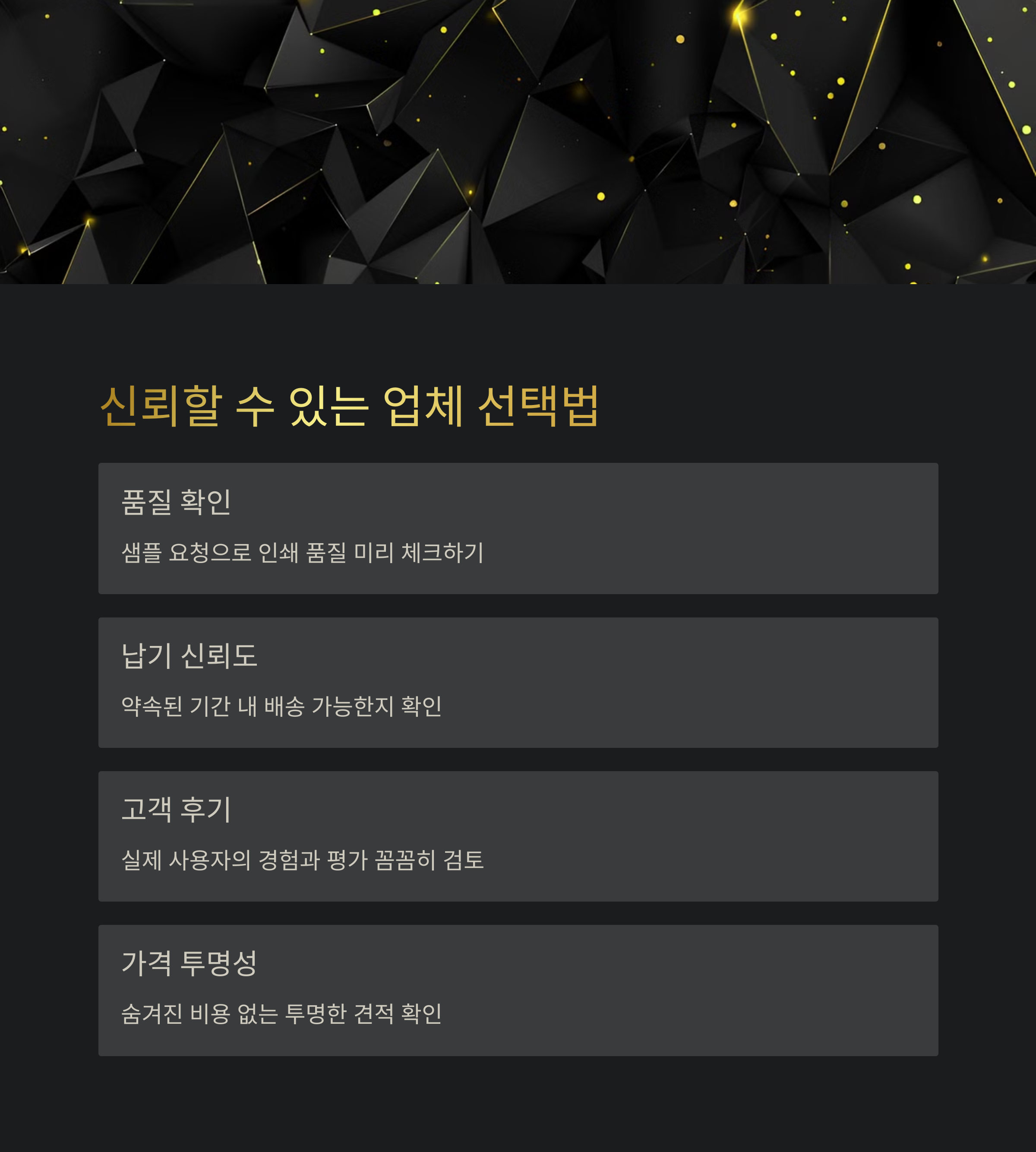 | 인쇄 품질 | 납기 신뢰도 | 가격과 후기 |