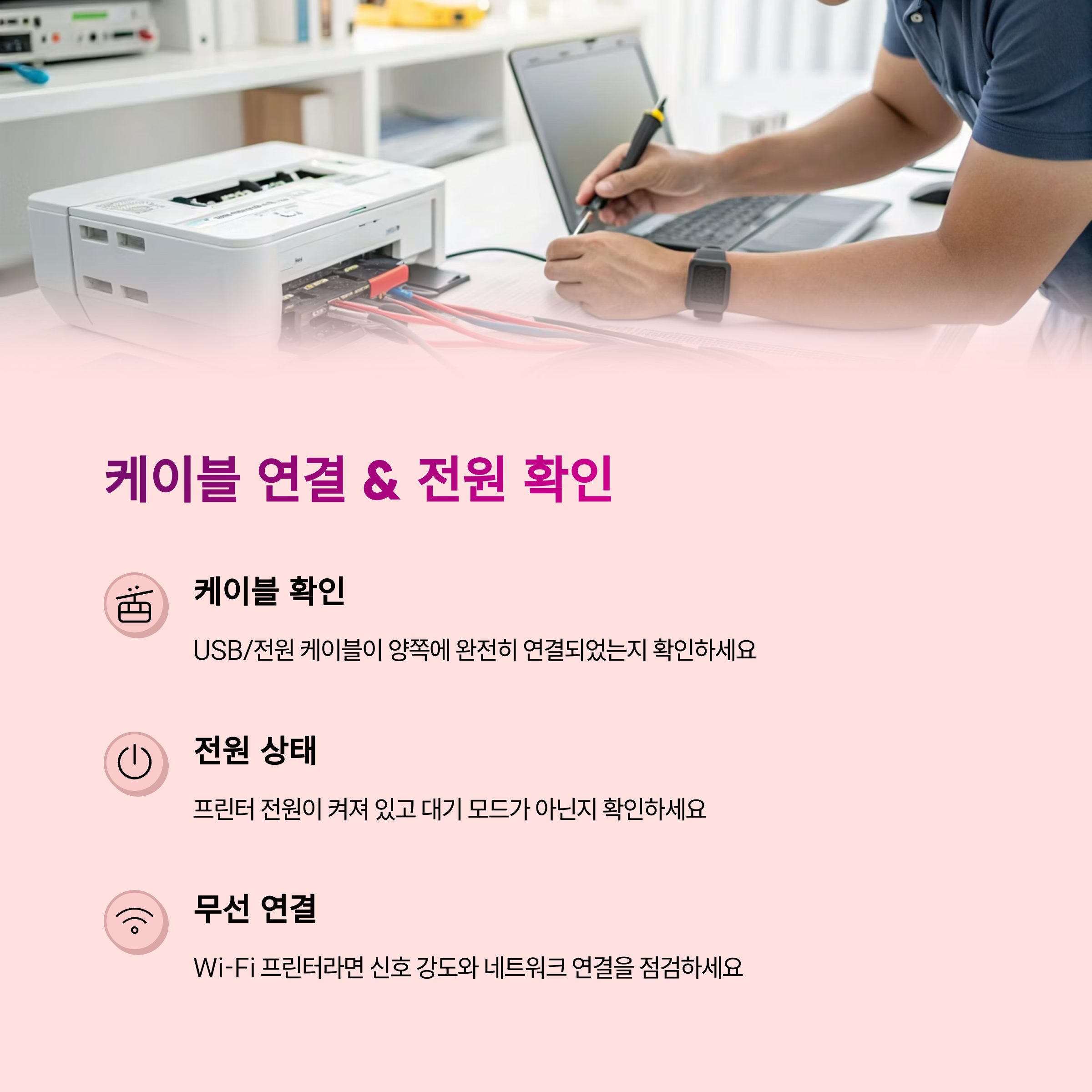 프린터의 전원이 꺼져 있거나, 케이블 연결이 느슨한 경우가 많습니다. 무선 프린터라면 Wi-Fi 연결도 점검해보세요.