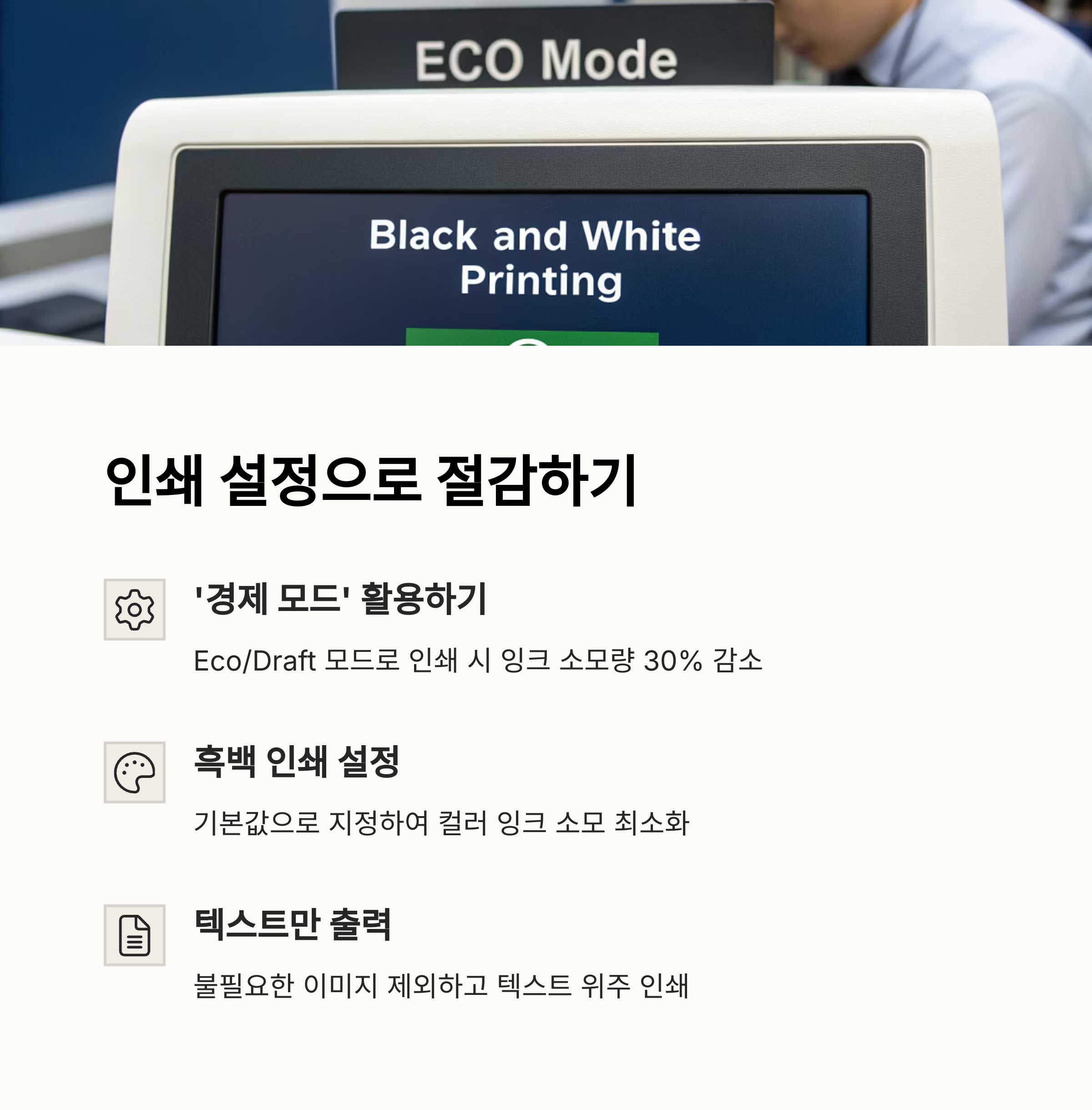 | 이미지 품질 낮춤 | 전체적인 잉크 사용량 감소 | 프리뷰용 문서 출력 시 |