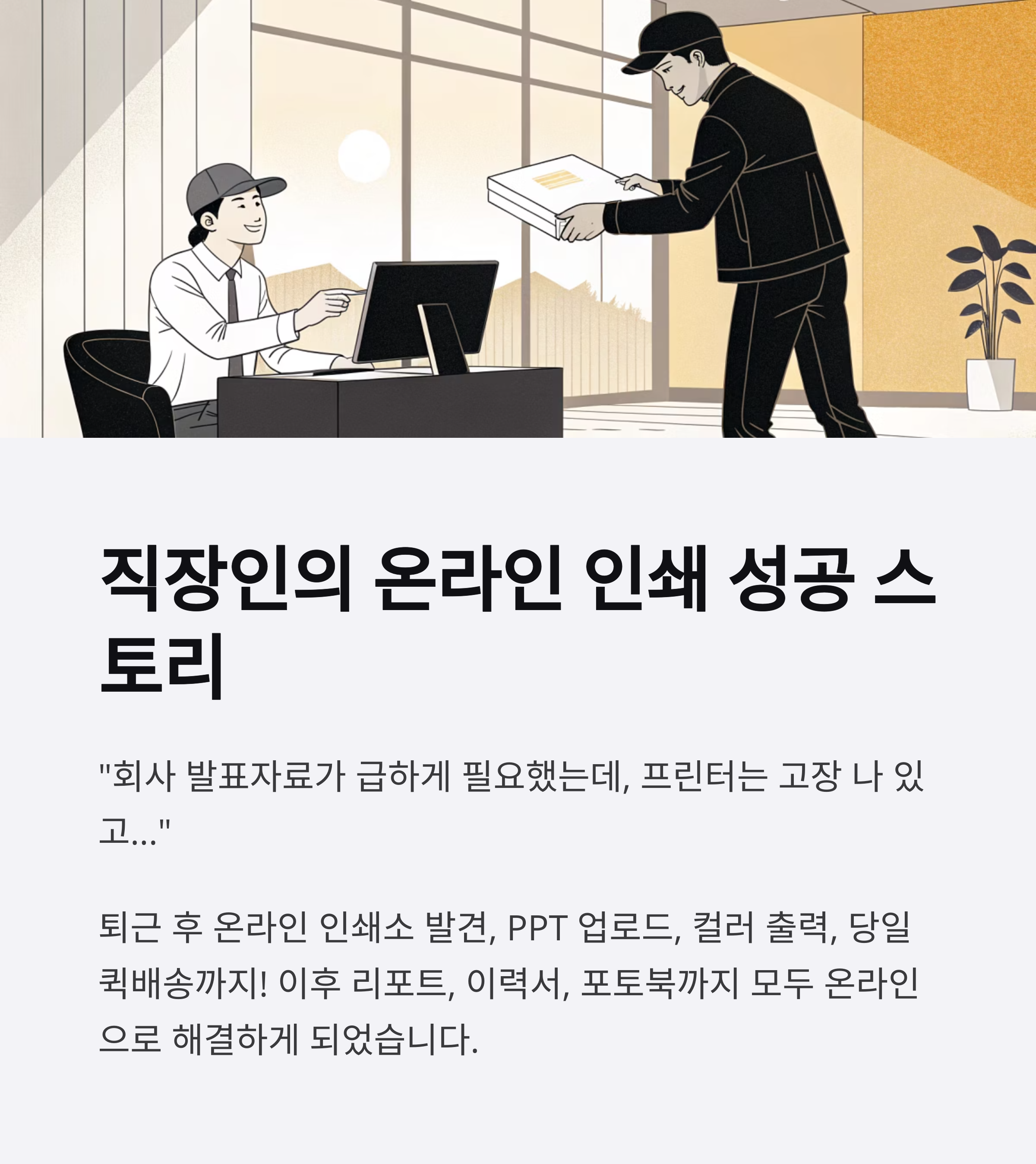 "생각보다 훨씬 쉽게 해결돼서 놀랐고, 인쇄 품질도 탁월했어요."