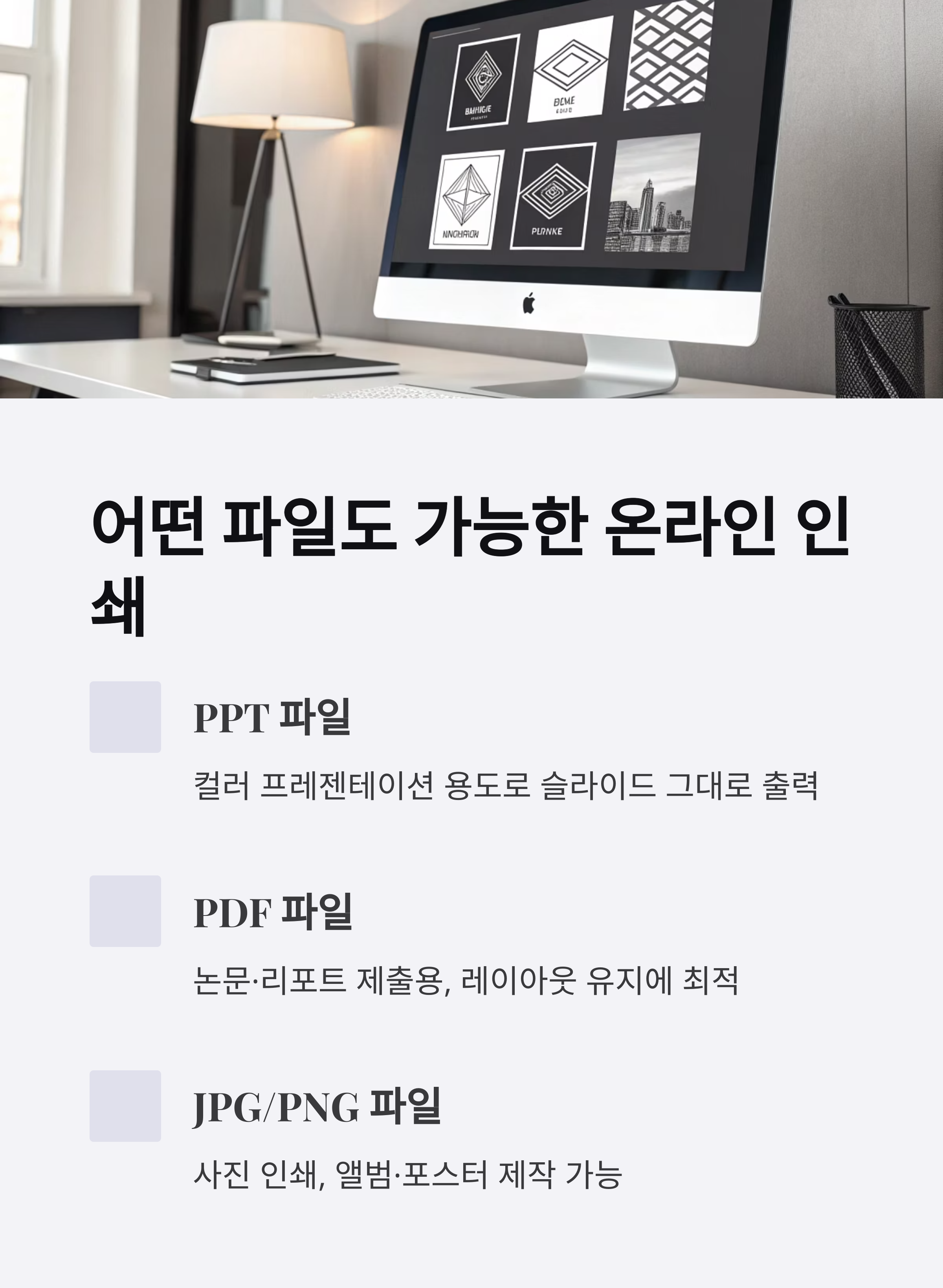 "파일 형식만 확인하면 집에서 못하던 인쇄도 온라인으로 손쉽게 해결할 수 있습니다."